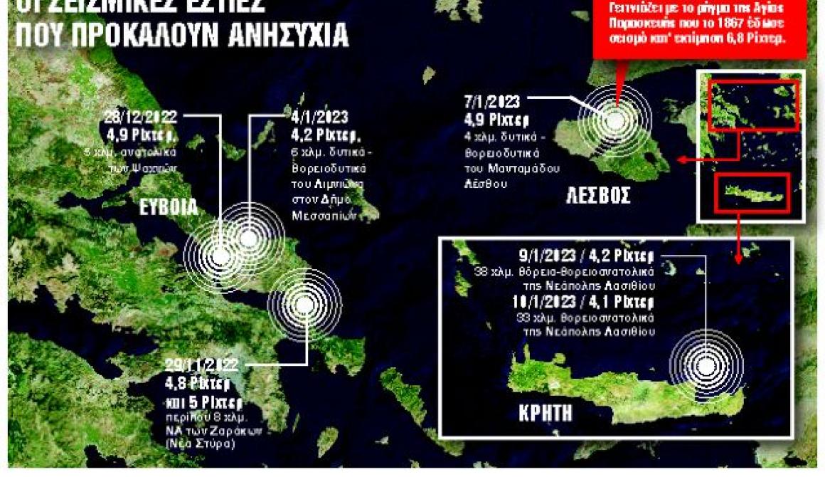 Εντονη ανησυχία προκαλεί στους επιστήμονες ο «χορός» των ρίχτερ που καταγράφεται στη χώρα το τελευταίο διάστημα, με τα ρήγματα σε Λέσβο, Εύβοια και Κρήτη να ξυπνούν άσχημες μνήμες. Αυτό που μεγαλώνει την αβεβαιότητα είναι η διέγερση τμημάτων κοντά σε κατοικημένες περιοχές, με τους σεισμολόγους να ζητούν από τους πολίτες να είναι ιδιαίτερα προσεκτικοί και σε εγρήγορση.