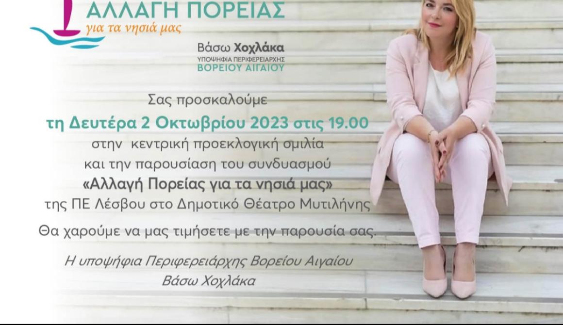 Σας ενημερώνουμε ότι στην αυριανή κεντρική προεκλογική συγκέντρωση της περιφερειακής παράταξης «Αλλαγή Πορείας για τα νησιά μας», με επικεφαλής την Βάσω Χοχλάκα και την οποία στηρίζει ο ΣΥΡΙΖΑ Προοδευτική Συμμαχία, θα παρευρεθεί και θα χαιρετίσει η τ. Βουλεύτής και νέα εκπρόσωπος τύπου του κόμματος κα Δώρα Αυγέρη.