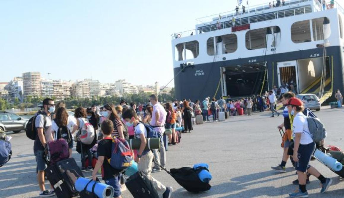 Τα πειράγματα στα πηγαδάκια δίνουν και παίρνουν στην ουρά για την επιβίβαση στο πλοίο, στο λιμάνι του Πειραιά.