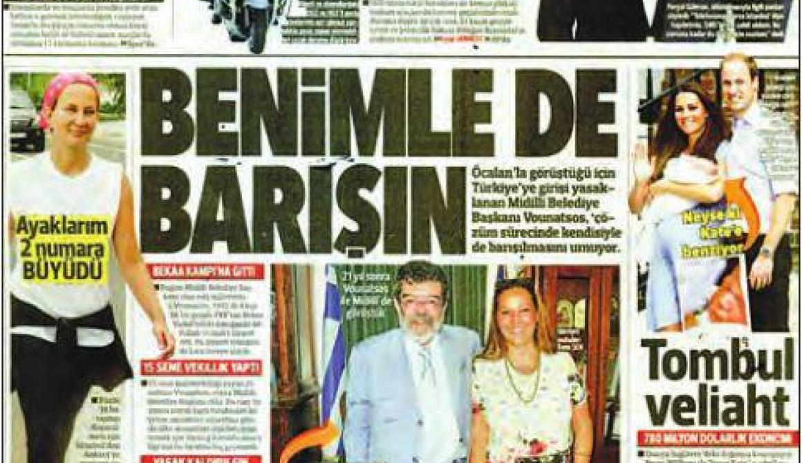 Ο Δημήτρης Βουνάτσος, στο ρεπορτάζ με τίτλο «Ειρήνη και μαζί μου», φέρεται να δηλώνει στην απεσταλμένη της εφημερίδας πως «δεν μπορεί να μπει στη χώρα που αγαπά, την Τουρκία». «Είμαι ένας άνθρωπος που υιοθετεί τη φιλία των λαών», λέει.