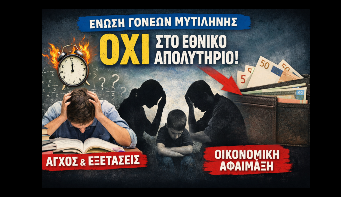 Με σκληρή γλώσσα και έντονες επισημάνσεις για τις συνέπειες στους μαθητές και τις οικογένειες, η Ένωση Συλλόγων Γονέων και Κηδεμόνων Δήμου Μυτιλήνης εκφράζει την κατηγορηματική της αντίθεση στην εφαρμογή του Εθνικού Απολυτηρίου από το σχολικό έτος 2027-2028.