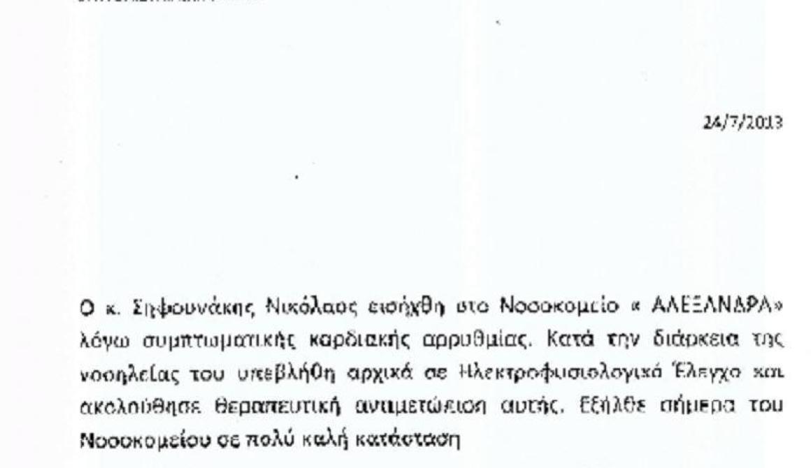 Ο Βουλευτής του Νομού Λέσβου, Νίκος Σηφουνάκης , εξερχόμενος από το «Πανεπιστημιακό Νοσοκομείο Αλεξάνδρα» σήμερα Τετάρτη 24-7- 2013, όπου υπεβλήθη σε εξετάσεις και νοσηλεία προέβη στην ακόλουθη δήλωση:
