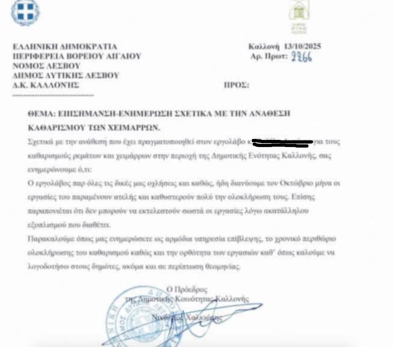 Στις 13 Οκτωβρίου 2025, ο Πρόεδρος της Δημοτικής Κοινότητας Καλλονής, Νικόλαος Χαλκιώτης, απέστειλε ένα υπηρεσιακό έγγραφο, που σήμερα φέρνει στο φως της δημοσιότητας το Lesvosnews.net και αποκτά πλέον εξαιρετικό ενδιαφέρον.