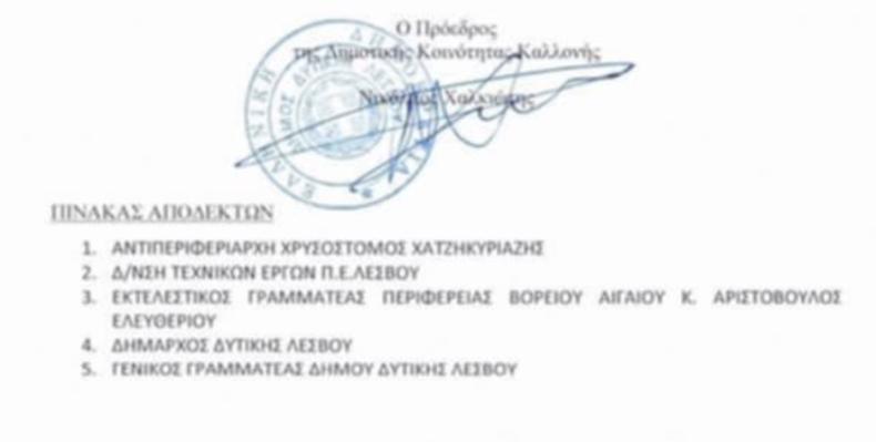 Οι αποδέκτες του εγγράφου του Προέδρου της Δημοτικής Κοινότητας Καλλονής δεν ήταν τυπικοί.... Ήταν ακριβώς εκείνοι που συγκροτούν τον θεσμικό κορμό της διαχείρισης των ρεμάτων στη Λέσβο: ο Αντιπεριφερειάρχης Χρυσόστομος Χατζηκυριάζης, η Διεύθυνση Τεχνικών Έργων της Π.Ε. Λέσβου, ο Εκτελεστικός Γραμματέας της Περιφέρειας Βορείου Αιγαίου , ο Δήμαρχος Δυτικής Λέσβου και ο Γενικός Γραμματέας του Δήμου.