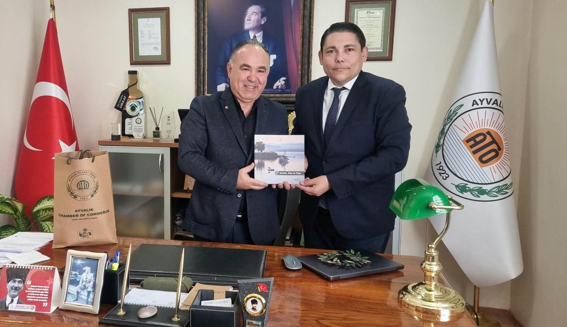 Στη συνέχεια, ο Γιάννης Μπουρνούς έγινε δεκτός από τον Πρόεδρο του Εμπορικού Επιμελητηρίου, κ. Αλί Ουτσάρ και μέλη του ΔΣ του Επιμελητηρίου. Στη συνάντηση συζητήθηκαν θέματα διμερούς συνεργασίας των δύο χωρών, αλλά και ειδικά των νησιών του Ανατολικού Αιγαίου με τις πόλεις των τουρκικών παραλίων. Το Επιμελητήριο του Αϊβαλίου διατηρεί επαφές με το Επιμελητήριο Λέσβου και άλλους τοπικούς φορείς της Λέσβου και η ηγεσία του εξέφρασε τη βούλησή της για ενδυνάμωση της διμερούς οικονομικής, τουριστικής και πολιτιστικής συνεργασίας.