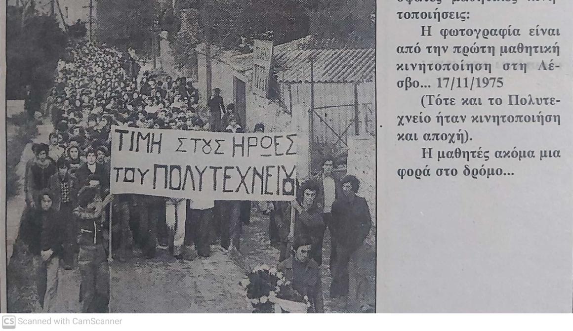 Στο αφιέρωμα του «Εμπρός» το 1995 εμφανίζεται η πρώτη μεγάλη πορεία για την επέτειο του Πολυτεχνείου στη Μυτιλήνη που πραγματοποιήθηκε στις 17 Νοέμβρη του 1975. Η πορεία και οι εκδηλώσεις που ακολούθησαν οργανώθηκαν από τη Λεσβιακή Κίνηση Μαθητών (ΛΕ.ΚΙ.Μ). Το πανό κρατάμε εγώ – Πρόεδρος τότε της Λεσβιακής Κίνησης και ο Μάνος Δούκας μέλος του Διοικητικού Συμβουλίου. Το στεφάνι κρατάει ο Στρατής Μάγειρας μέλος επίσης του Διοικητικού Συμβουλίου. Στο Συμβούλιο τότε και η Σοφία, ο Γιώργος, ο Στρατής, η Αντιόπη, η Καλλιόπη, ο Μάριος. Αν ξέχασα κάποιον, να με συγχωρήσει.