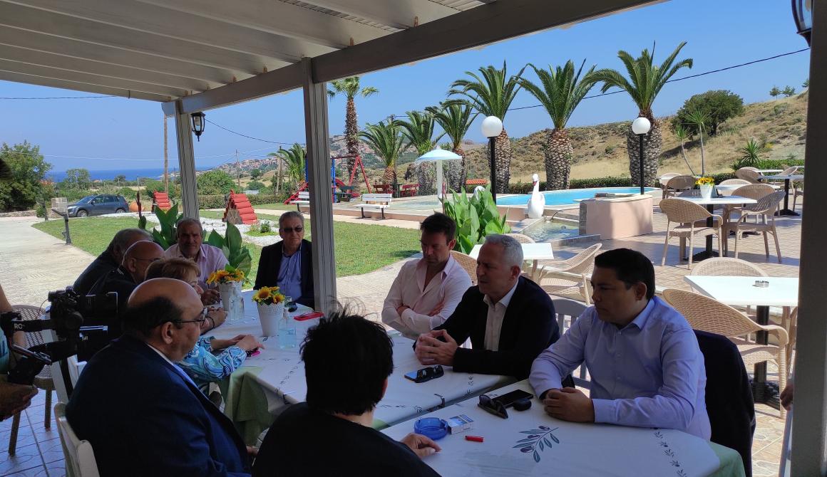 Ακολούθησε συνάντηση στον Μόλυβο με φορείς του Τουρισμού, του πρωτογενή τομέα, αυτοδιοικητικών στελεχών και με τον Δήμαρχο Δυτικής Λέσβου κ.Ταξίαρχη Βέρρο, όπου και αναπτύχθηκαν ζητήματα που αφορούν την ασφάλεια, το προσφυγικό, τις θαλάσσιες μεταφορές, τον τουρισμό και τον πρωτογενή τομέα του νησιού.