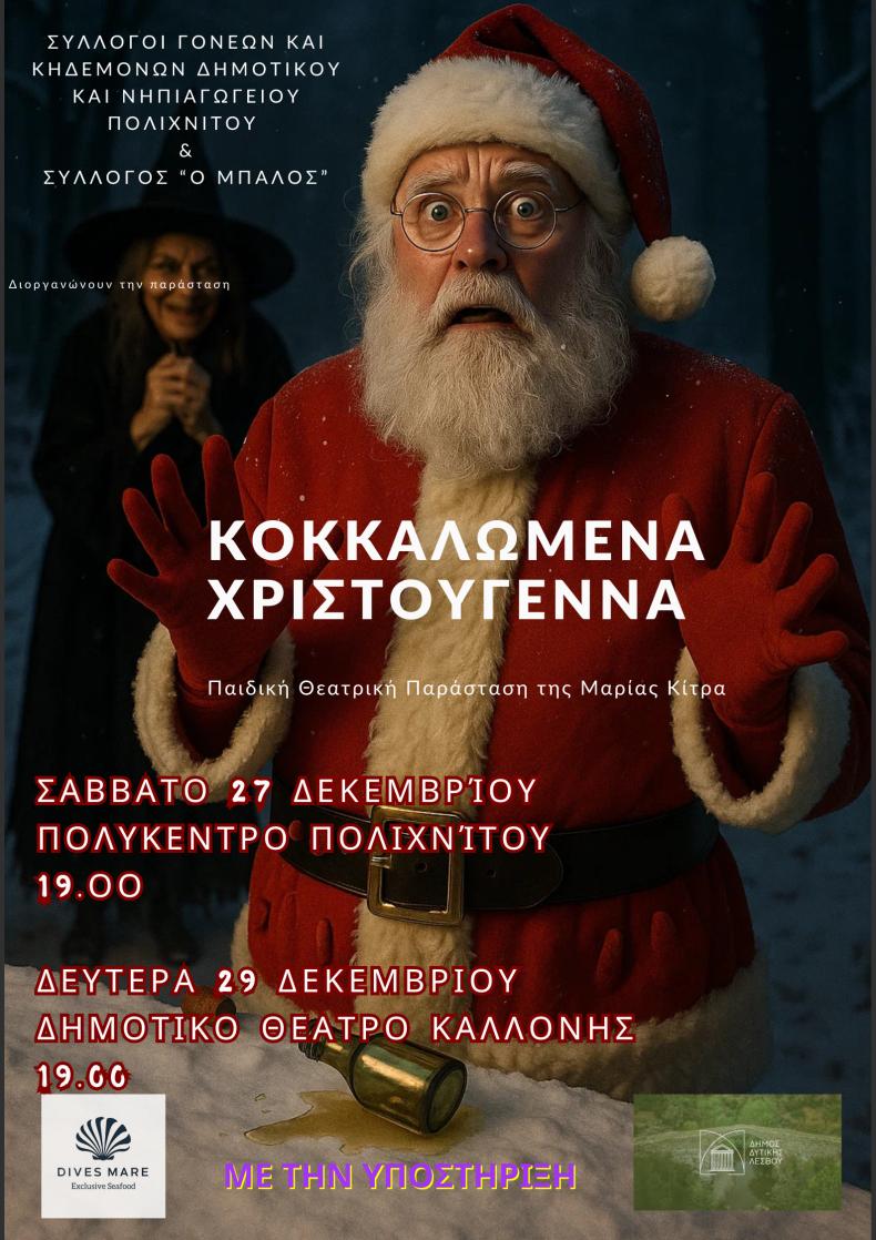 Στο Πολύκεντρο Πολιχνίτου παρουσιάζεται η παιδική θεατρική παράσταση «Κοκκαλωμένα Χριστούγεννα», σε μια ευφάνταστη και χιουμοριστική ιστορία γεμάτη ανατροπές. Οι συλλογοι Γονέων και Κηδεμόνων Δημοτικου και Νηιαγωγείου Πολιχνίτου μαζί με τον Σύλλογο"ο Μπάλος" ετοιμάζονται για το σανίδι !