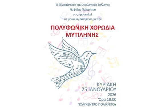 Η Πολυφωνική Χορωδία Μυτιλήνης, στην πρώτη της εκδήλωση για το 2026, συνεργάζεται με τον Εξωραϊστικό και Οικολογικό Σύλλογο Νυφίδας Πολιχνίτου και παρουσιάζουν ένα μουσικό σύνολο από το έντεχνο Ελληνικό Τραγούδι στο Πολύκεντρο Πολιχνίτου την Κυριακή 25 Ιανουαρίου και ώρα 6 το απόγευμα, με ελεύθερη...