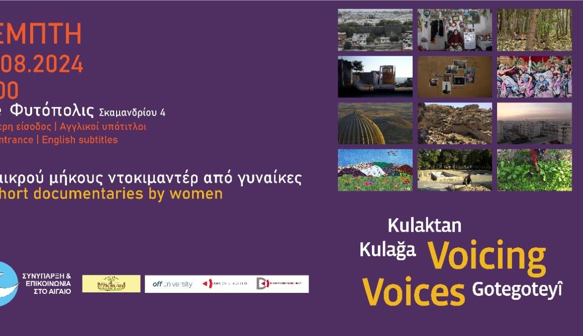 Την Πέμπτη 8 Αυγούστου, από τις 9.00μμ μέχρι και λίγο μετά τις 10.30μμ, η Συνύπαρξη και Επικοινωνία στο Αιγαίο πραγματοποιεί στο CineΦΥΤΟΠΟΛΙΣ (Σκαμανδρίου 4, Μυτιλήνη) την κινηματογραφική προβολή “Voicing Voices” (Kulaktan Kulağa / Gotegoteyî), όπου θα προβληθούν 12 μικρού μικρούς ντοκιμαντέρ από γυναίκες, με αγγλικούς υπότιτλους.