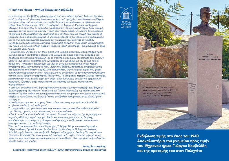 Την Δευτέρα 27 Οκτωβρίου στις 5 το απόγευμα στην πλατεία του Ηρώου του Πολιχνίτου, διοργανώνει εκδήλωση τιμής στο έπος του 1940 και στον ήρωα Εύελπη Γιώργο Κουβελίδη. Κατά την εκδήλωση θα πραγματοποιηθούν και τα αποκαλυπτήρια του μνημειακού χώρου με την προτομή του Γιώργου Κουβελίδη. Τη δημιουργία του μνημειακού αυτού χώρου αποφάσισε ο Δήμος Δυτικής Λέσβου και υλοποιήθηκε από τη Σχολή Καλών Τεχνών του Πανεπιστημίου Δυτικής Μακεδονίας με επιστημονικά υπεύθυνο τον Εικαστικό καθηγητή Χάρη Κοντοσφύρη ενώ η προτομή αποτελεί έργο του καθηγητή Χρήστου Τσώτσου.