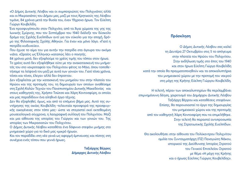 «Ο Δήμος Δυτικής Λέσβου και οι συμπατριώτες του Πολιχνιάτες αλλά και οι Μικρασιάτες του Δήμου μας, μαζί με τους Κρητικούς της Λέσβου τιμάνε, 84 χρόνια μετά την θυσία του, έναν 19χρονο ήρωα. Τον Εύελπη Γιώργο Κουβελίδη.