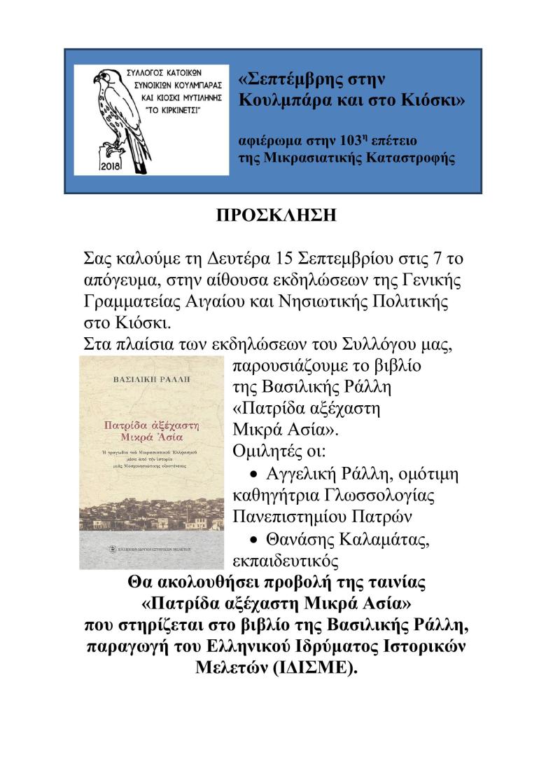 Η εκδήλωση αφορά την 103 επέτειο της Μικρασιατικής Καταστροφής. Θα παρουσιαστεί το βιβλίο της αξέχαστης Βασιλικής Ράλλη με τίτλο «Πατρίδα αξέχαστη Μικρά Ασία».