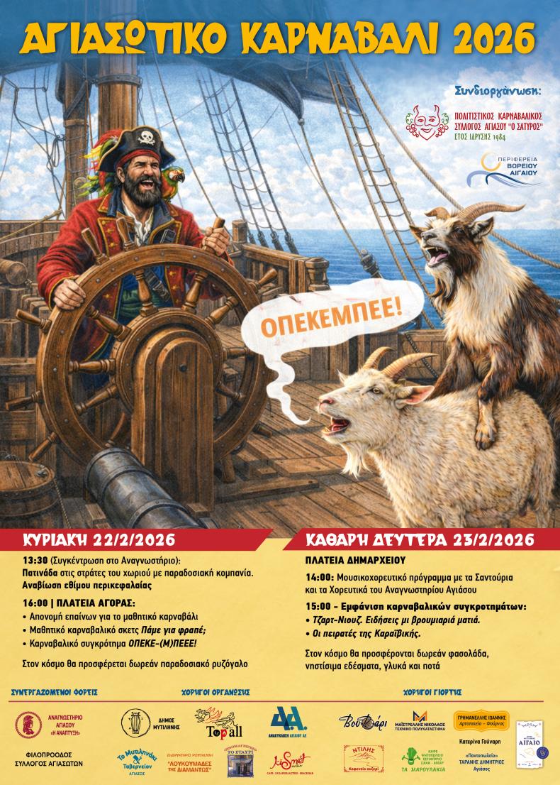 Ο Πολιτιστικός Καρναβαλικός Σύλλογος Αγιάσου «Ο Σάτυρος» ανακοινώνει το πρόγραμμα των φετινών αποκριάτικων εκδηλώσεων, που συνδιοργανώνονται με την Περιφέρεια Βορείου Αιγαίου.