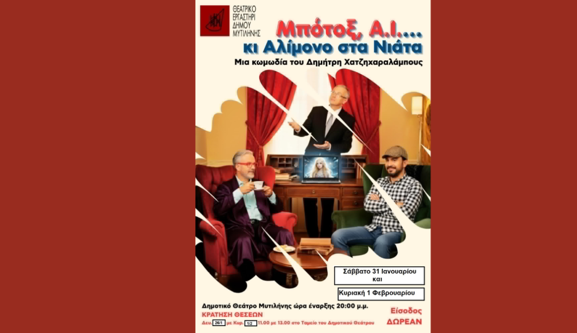 Το Θεατρικό Εργαστήρι του Δήμου Μυτιλήνης, τιμώντας το σύγχρονο νεοελληνικό θέατρο, μετά και την επιτυχία των αρχικών παραστάσεων του περασμένου Νοεμβρίου, παρουσιάζει εκ νέου την κωμωδία του Δημήτρη Χατζηχαραλάμπους «Μπότοξ ΑΙ …κι αλίμονο στα νιάτα», το Σάββατο 31 Ιανουαρίου και την Κυριακή 1 Φεβρουαρίου, στο Δημοτικό Θέατρο Μυτιλήνης.