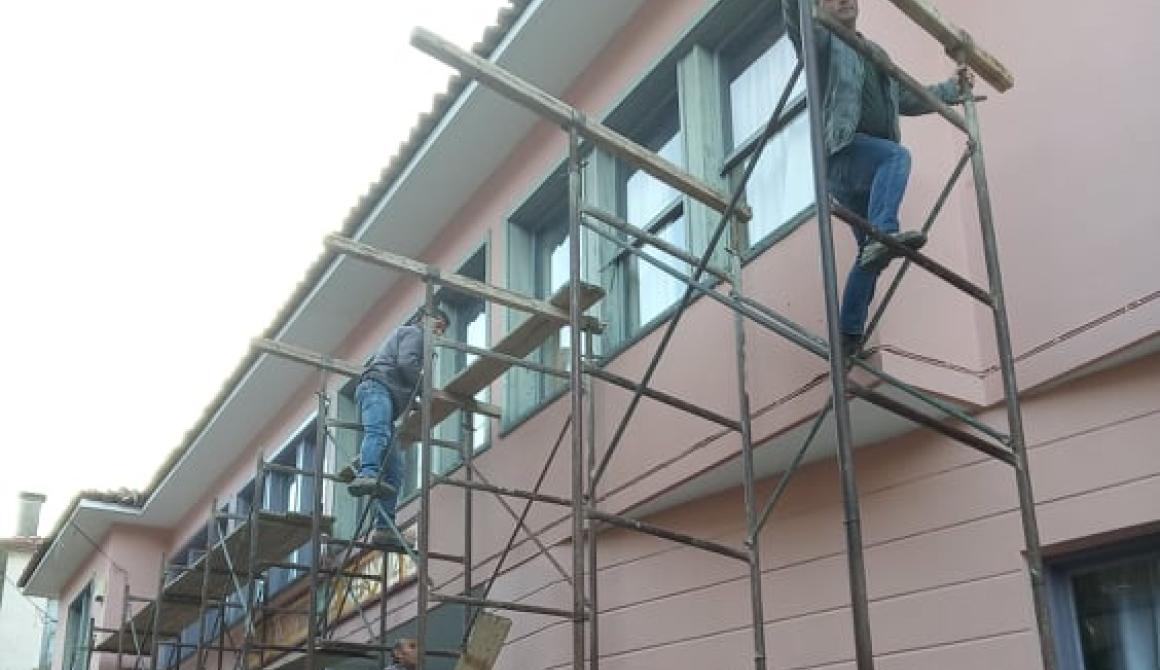 Ευτυχώς, ο Δήμος Μυτιλήνης αφουγκράστηκε τα μηνύματά μας και χωρίς δεύτερη κουβέντα έτρεξε στο πλαίσιο των δυνατοτήτων του, να μας βοηθήσει με το βάψιμο των εξωτερικών επιφανειών των κτιρίων του. Οι εργασίες άρχισαν τον Αύγουστο και περατώθηκαν αυτές τις μέρες με μεγάλα διαλείμματα.