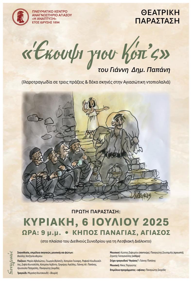 Η Θεατρική ομάδα του Αναγνωστηρίου Αγιάσου θα ανεβάσει το προσεχές καλοκαίρι το έργο Αγιασώτη συγγραφέα Γιάννη Δημ. Παπάνη: «Έκουψι γιου Κοπ’ς»