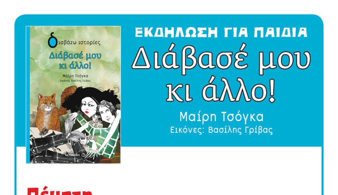 Το βιβλιοπωλείο Book and Art και οι Εκδόσεις Μεταίχμιο προσκαλούν τους μικρούς τους φίλους σε εκδήλωση με αφορμή το βιβλίο Διάβασέ μου κι άλλο της Μαίρης Τσόγκα, την Πέμπτη 21 Ιουλίου 2016, στις 7:30μ.μ., στον χώρο του βιβλιοπωλείου (Κομνηνάκη 5, τηλ. 22510.37961).