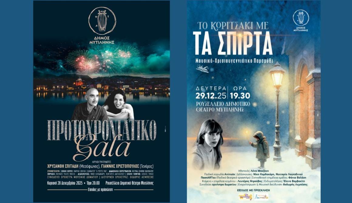 Δωρεάν προσκλήσεις θα διαθέσει ο Δήμος Μυτιλήνης στο κοινό για τις δύο μεγάλες εορταστικές εκδηλώσεις του στο Δημοτικό Θέατρο, το Πρωτοχρονιάτικο Gala την Κυριακή 28 Δεκεμβρίου στις 20:00 και την παράσταση «Το Κοριτσάκι με τα Σπίρτα» την Δευτέρα 29 Δεκεμβρίου στις 19:30. Οι προσκλήσεις θα διατίθενται από το ταμείο του Δημοτικού Θεάτρου την Δευτέρα 22 Δεκεμβρίου κατά τις ώρες 12:00 – 14:00 και έως τη εξάντλησή τους.