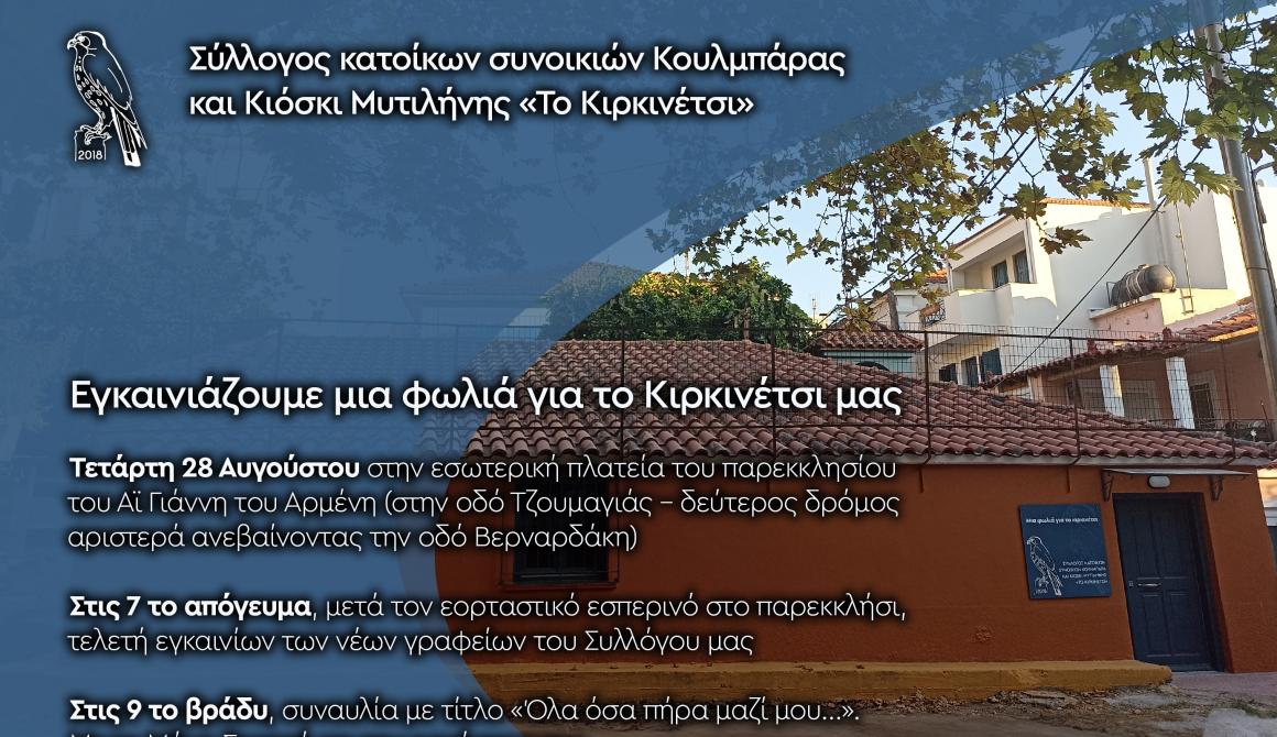 Με συναυλία του Μάνου Σιμιτσή και της ορχήστρας του με τίτλο «Όλα όσα πήρα μαζί μου…» την Τετάρτη 28 Αυγούστου στις 9 το βράδυ στην εσωτερική πλατεία του παρεκκλησίου του Αϊ Γιάννη «του Αρμένη» (στην οδό Τζουμαγιάς – δεύτερος δρόμος αριστερά ανεβαίνοντας την οδό Βερναρδάκη), ο Σύλλογος των κατοίκων των συνοικιών Κουλμπάρα και Κιόσκι Μυτιλήνης «το κιρκινέτσι» γιορτάζει το άνοιγμα των γραφείων του. Ο χώρος αυτός του Συλλόγου, η «φωλιά για το κιρκινέτσι μας» όπως χαρακτηριστικά ονομάστηκε, βρίσκεται παραπλεύρως του παρεκκλησίου του Αϊ Γιάννη «του Αρμένη».