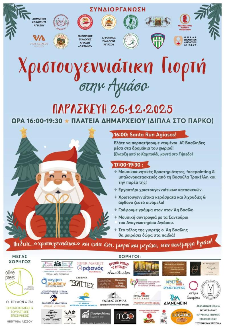 Η Αγιάσος φοράει τα γιορτινά της και δίνει ραντεβού με τη χαρά. Για τρίτη συνεχόμενη χρονιά, οι Σύλλογοι και οι Φορείς του χωριού ενώνουν δυνάμεις και προσκαλούν μικρούς και μεγάλους στη Χριστουγεννιάτικη Γιορτή που θα πραγματοποιηθεί την Πέμπτη 26 Δεκεμβρίου 2025, στην πλατεία Δημαρχείου, από τις 17:00 έως τις 19:30.