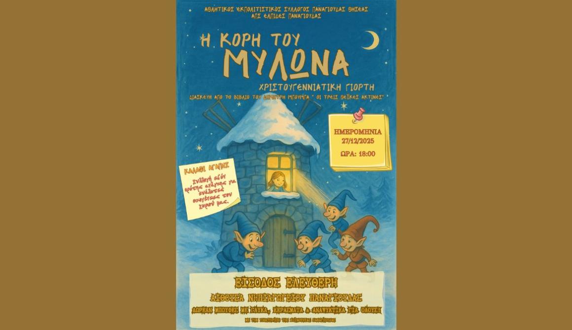 Κεντρικός άξονας της βραδιάς είναι η παιδική θεατρική παράσταση «Η Κόρη του Μυλώνα», διασκευή του παραμυθιού «Οι Τρεις Θεϊκές Ακτίνες». Πρόκειται για βιβλίο που εκδόθηκε από την Εταιρεία Αιολικών Μελετών και δημιουργήθηκε αποκλειστικά αφιλοκερδώς: συγγραφή από τον πρόεδρό της Δημήτρη Μπούμπα και εικονογράφηση από το μέλος του Δ.Σ. Αντώνη Ζεϊβέκη. Καμία εμπορική στόχευση, κανένα οικονομικό όφελος. Μόνο ουσία.