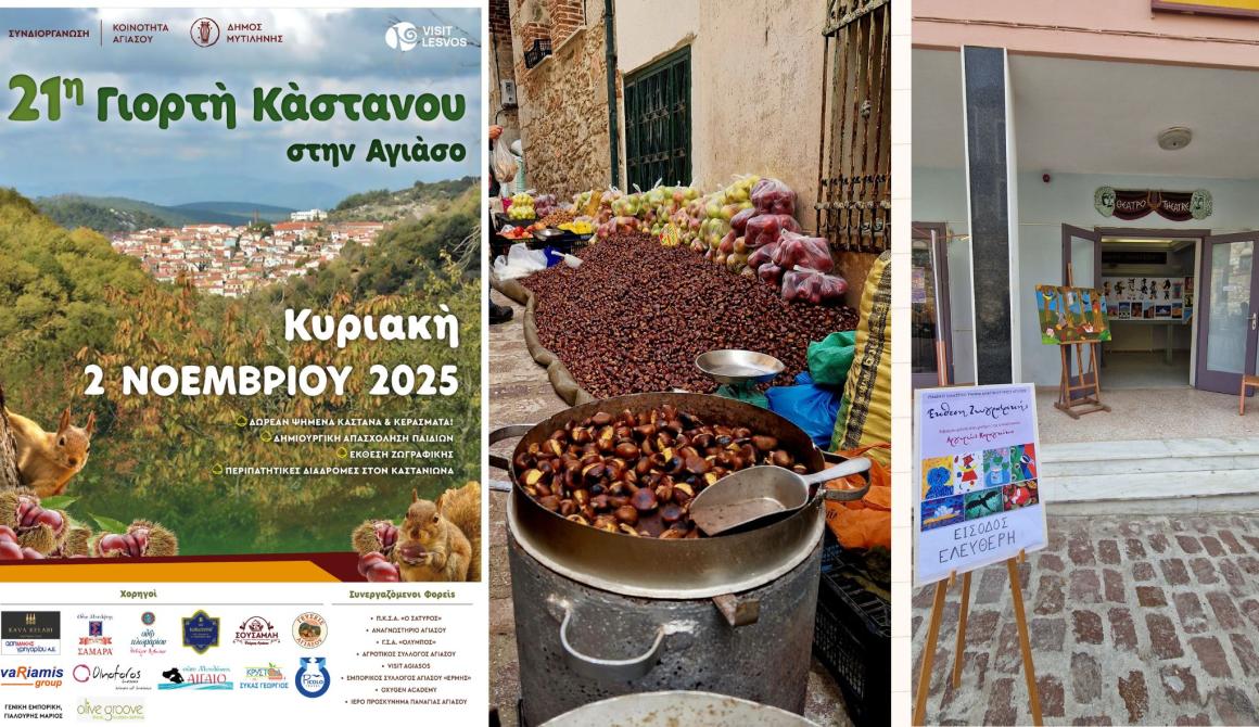 Η μυρωδιά του ψημένου κάστανου τύλιξε σήμερα την Αγιάσο, καθώς το ιστορικό χωριό του Ολύμπου γιόρτασε την 21η Γιορτή Κάστανου — έναν θεσμό που εδώ και δύο δεκαετίες ενώνει τη γεύση, την παράδοση και τη λεσβιακή ψυχή. Από νωρίς το πρωί, η πλατεία Δημαρχείου πλημμύρισε από κόσμο, χαμόγελα, φουφούδες, μουσικές και παιδικές φωνές, σε μια γιορτή που ξαναδίνει πνοή στο φθινόπωρο της Λέσβου.