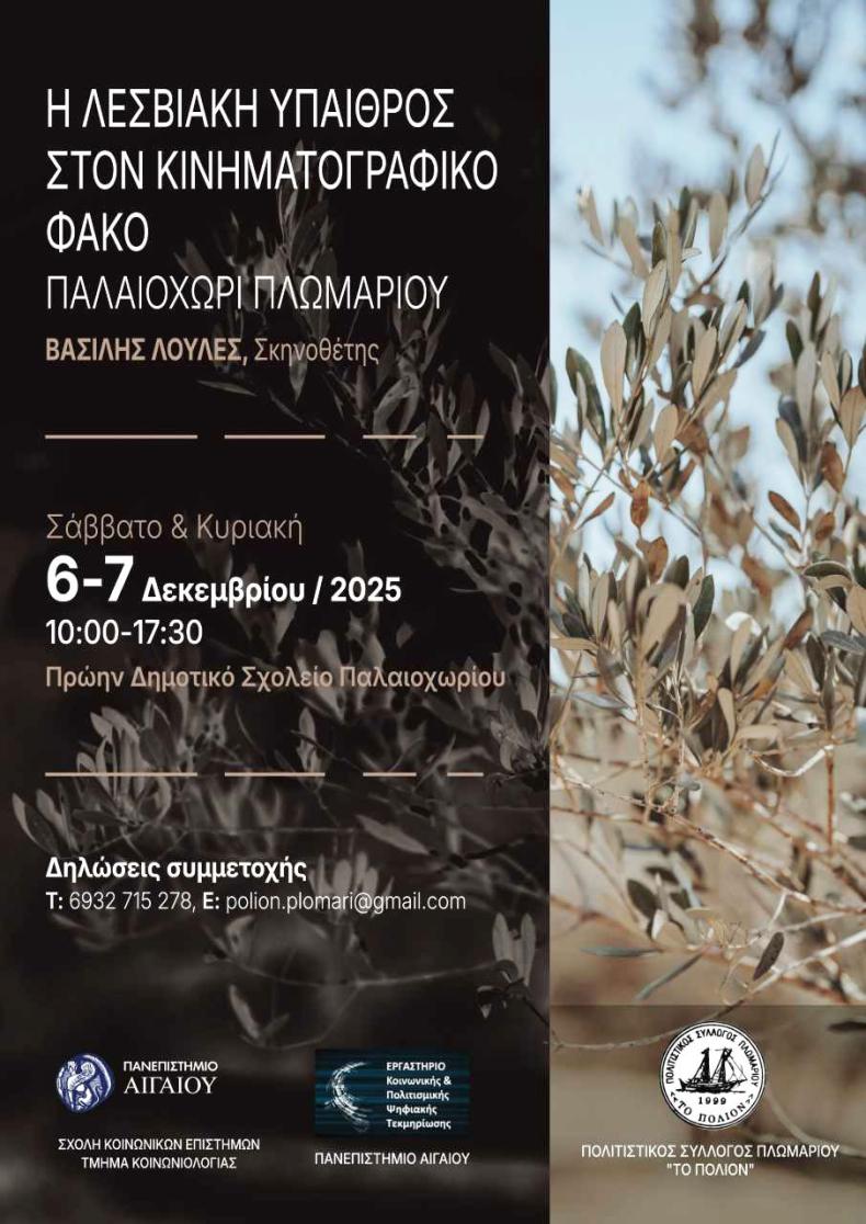 είναι ο τίτλος του διήμερου κινηματογραφικού εργαστηρίου που θα πραγματοποιηθεί το Σάββατο 6 και την Κυριακή 7 Δεκεμβρίου 2025, στο πρώην Δημοτικό Σχολείο Παλαιοχωρίου στο Πλωμάρι, Λέσβος. Την οργάνωση του εργαστηρίου επιμελήθηκε η Καθηγήτρια Αναστασία Ζήση, Διευθύντρια του Δ.Π.Μ.Σ. Εφαρμοσμένη-Κλινική Κοινωνιολογία και Τέχνη και του Εργαστηρίου Κοινωνικής, Πολιτισμικής και Ψηφιακής Τεκμηρίωσης, Τμήμα Κοινωνιολογίας, Πανεπιστήμιο Αιγαίου σε συνεργασία με τον ιστορικό Πολιτιστικό Σύλλογο Πλωμαρίου το Πόλιον.