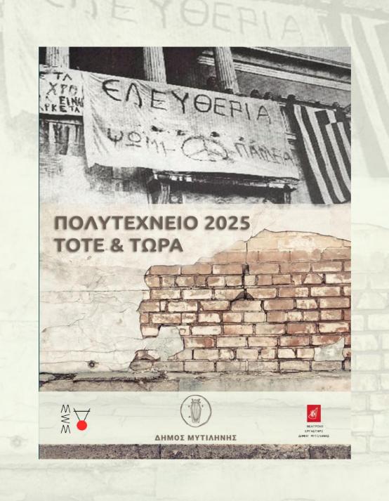 Το βράδυ, στις 20:30, αμέσως μετά την πορεία, το Δημοτικό Θέατρο Μυτιλήνης ανοίγει τις πόρτες του για την μεγάλη επετειακή εκδήλωση με τίτλο «Πολυτεχνείο 2025: Τότε και Τώρα», με ελεύθερη είσοδο για όλους.