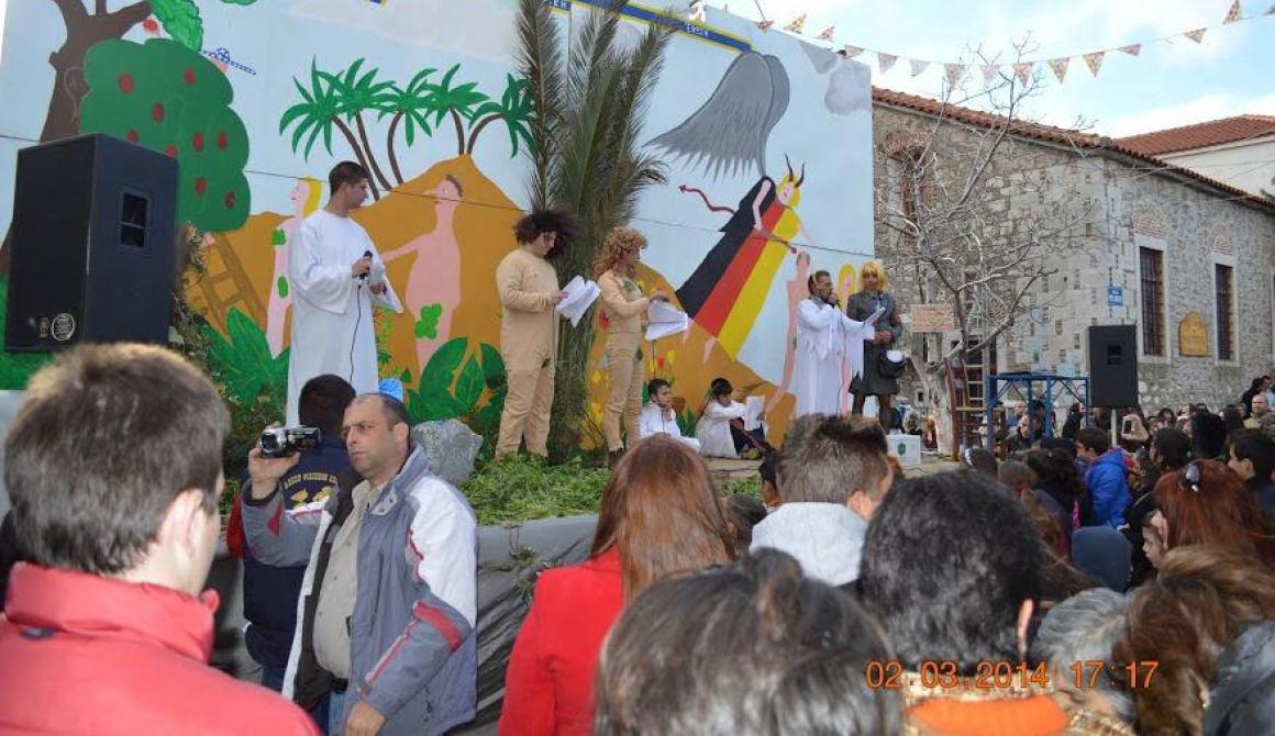 Την Κυριακή, 2 Μαρτίου 2014, από τις πρωινές ώρες όμιλος μεταμφιεσμένων γυναικών περιδιάβηκε τις γειτονιές του χωριού τραγουδώντας τα παραδοσιακά αθυρόστομα τριψίματα και κατέληξε στο Καμπούδι, όπου στις 3:30 μμ παρουσιάστηκε το καρναβαλικό συγκρότημα «Αδάμ και Εύα». Σάτιρα: Δημήτρης Τζαννής. Σκηνικά: Χρίστος Κουφέλος, Δημήτρης Ψαρρός, Δούκας Γουγουτάς, Γιάννης Καμπιρέλης, Ηλίας Χατζέλης, Παναγιώτης Κουλαξιζέλης, Παναγιώτης Λεβέντης, Γιάννης Χατζέλης, Μάριος Χαλέλης, Παναγιώτης Βασλάς, Νίκος Ψυρούκης, Ντόρης Ζεγκιολάρι, Γιώργος Λεβέντης, Μιχάλης Τζαννής. Ζωγραφική: Παναγιώτης Τζαννής, Δημήτρης Ψαρρός, Γρηγόρης Βαλαλάς, Ταξιάρχης Καρέτος, Δούκας Γουγουτάς. Εκφωνούν: Γιώργος Λεβέντης, Μαρίνος Κορομηλάς, Δημήτρης Π. Κορομηλάς, Ηλίας Χατζέλης, Παναγιώτης Κουλαξιζέλης, Παναγιώτης Λεβέντης, Ντόρης Ζεγκιολάρι, Θεόδωρος Χατζηχρυσάφης.