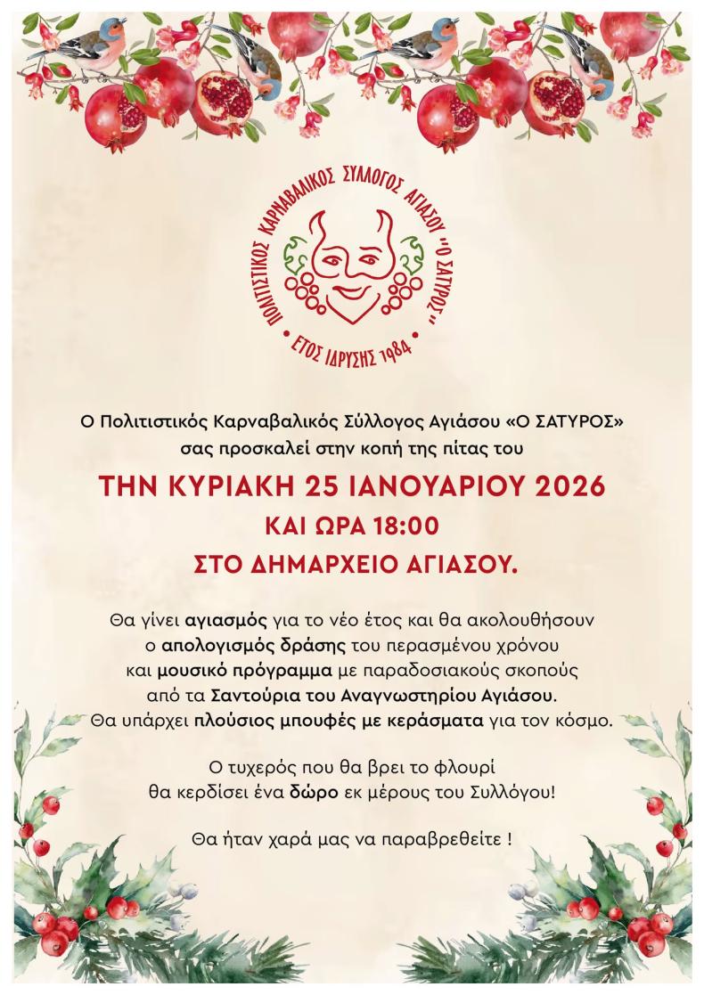 Την Κυριακή, 25 Ιανουαρίου 2026, στις 6 μ.μ. στην αίθουσα συνεδριάσεων του Κοινοτικού Συμβουλίου Αγιάσου θα γίνει η εκδήλωση κοπής βασιλόπιτας του Πολιτιστικού Καρναβαλικού Συλλόγου Αγιάσου «Ο Σάτυρος».