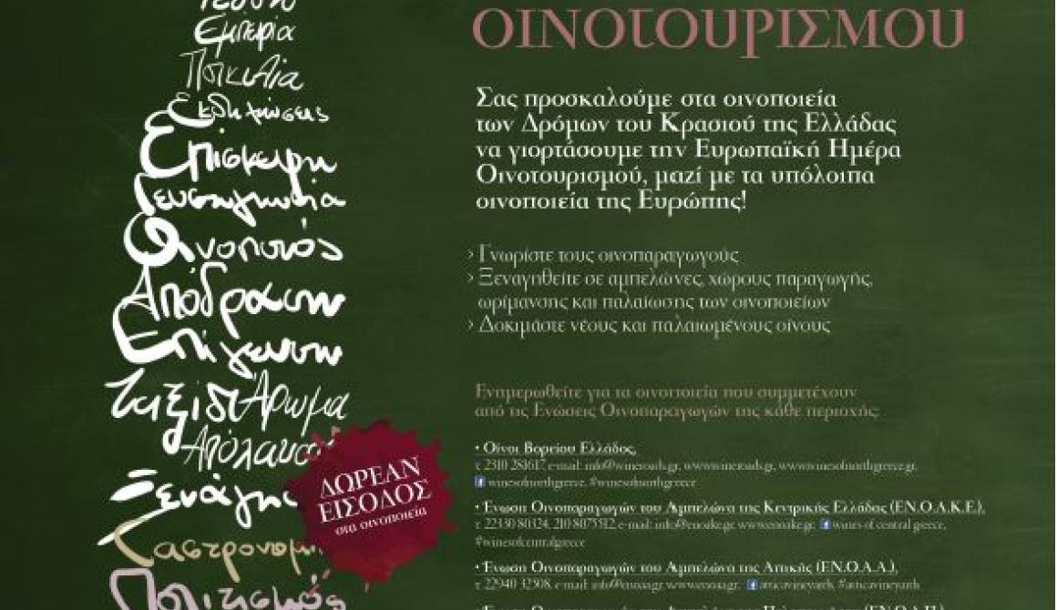 Την Κυριακή 10 Νοεμβρίου τα οινοποιεία των Δρόμων του Κρασιού της Ελλάδας, συμμετέχουν μαζί με εκατοντάδες άλλα οινοποιεία της Ευρώπης, στην Ευρωπαϊκή Ημέρα Οινοτουρισμού και σας προσκαλούν να γιορτάσετε μαζί τους.