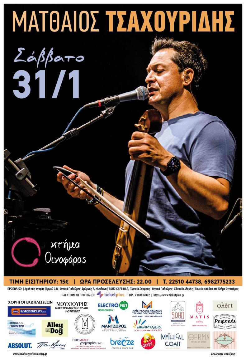 Ο ΜΑΤΘΑΙΟΣ ΤΣΑΧΟΥΡΙΔΗΣ ΣΤΗΝ ΜΥΤΙΛΗΝΗ , ΣΤΟ ΚΤΗΜΑ ΟΙΝΟΦΟΡΟΣ ΤΟ ΣΑΒΒΑΤΟ 31 Ιανουαρίου 2026, ΩΡΑ 22:00 μ.μ.