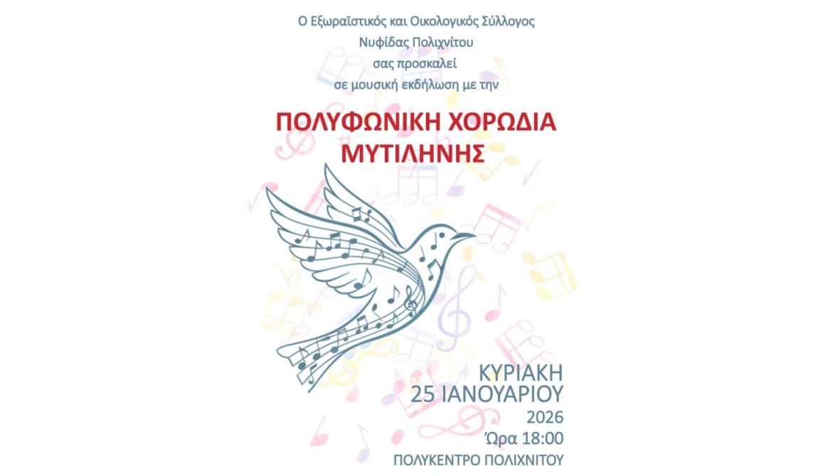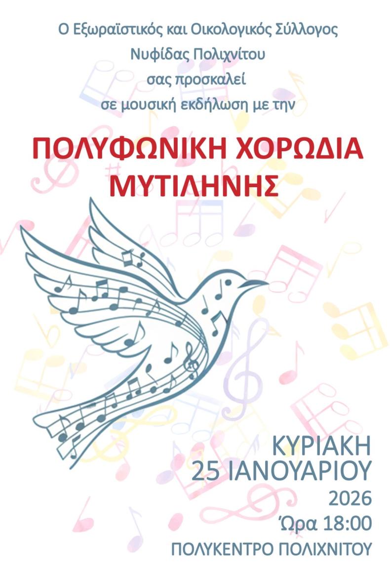 Η Πολυφωνική Χορωδία Μυτιλήνης, στην πρώτη της εκδήλωση για το 2026, συνεργάζεται με τον Εξωραϊστικό και Οικολογικό Σύλλογο Νυφίδας Πολιχνίτου και παρουσιάζουν ένα μουσικό σύνολο από το έντεχνο Ελληνικό Τραγούδι στο Πολύκεντρο Πολιχνίτου την Κυριακή 25 Ιανουαρίου και ώρα 6 το απόγευμα, με ελεύθερη είσοδο.