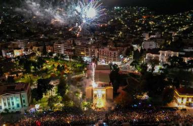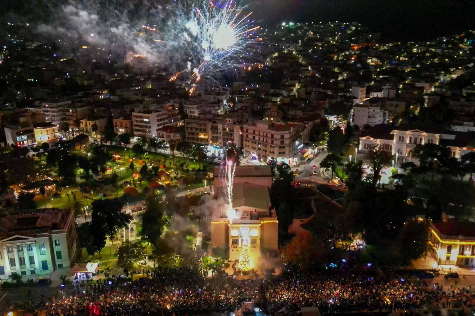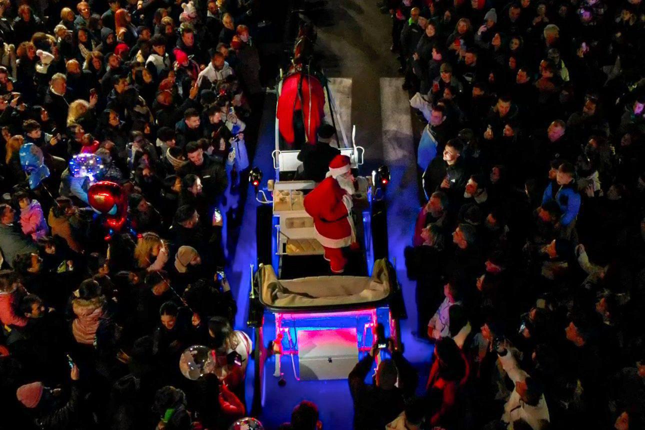 Ο Άη-Βασίλης αποφάσισε φέτος να… σπάσει το πρωτόκολλο. Κατέφθασε νωρίτερα από το προγραμματισμένο, καβάλα σε άμαξα με άλογο, ανάμεσα σε λάμψεις και πυροτεχνήματα, σκορπίζοντας καραμέλες στο πλήθος που ξέσπασε σε γέλια και χειροκροτήματα.