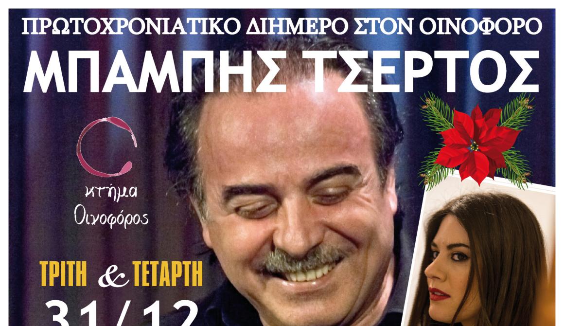 Παραμονή και ανήμερα Πρωτοχρονιάς στον Οινοφόρο με τον μοναδικό ΜΠΑΜΠΗ ΤΣΕΡΤΟ. Μαζί του η εξαιρετική τραγουδίστρια Ειρήνη Τουμπάκη.