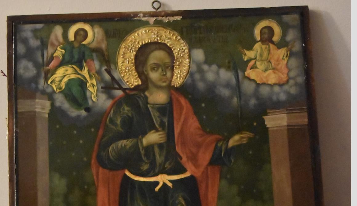 Στο επίκεντρο του πανηγυριού, η εικόνα του Αγίου Γεωργίου του Χιοπολίτη, ζωγραφισμένη το 1865 από τον άγνωστο Κυδωνιάτη ζωγράφο «αναγιώτη Ζουγράφου» όπως αναφέρεται, «δια συνδρομής και εξόδων των εν τη πόλει ταύτη διαμενόντων Κυδωνιέων». Από Αιβαλιώτες δηλαδή του πρώτου διωγμού το 1821, του διωγμού εκείνου για τη συμμετοχή της πόλης στην Ελληνική Επανάσταση. Πρόσφυγες που δεν ξαναγύρισαν να ξαναχτίσουν το Αϊβαλί το 1832. Έμειναν στη Μυτιλήνη, σχημάτισαν μια μικρή κοινότητα – πρεσβεία της «καρσινής» Πολιτείας τους, έμποροι στην πλειοψηφία τους κάτοικοι της Κουλμπάρας και του Κιοσκιού οι οποίοι και κάθε μέρα τιμής του Αγίου τους μαζευόταν για να τον τιμήσουν στην εκκλησία του Αγίου Γεωργίου Μυτιλήνης στην οποία και ιστόρησαν και την εικόνα του. Όπως έκαναν φυσικά και στο Αϊβαλί. Πριν οι άνθρωποι του φύγουν το 1917 και ξανά το 1922.