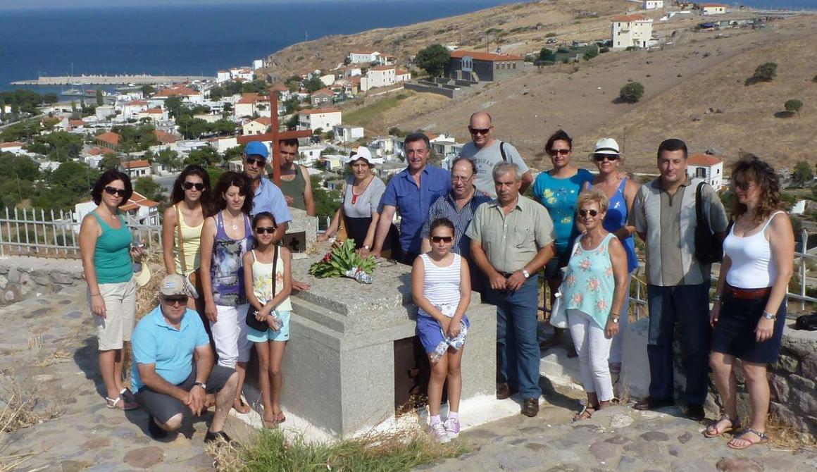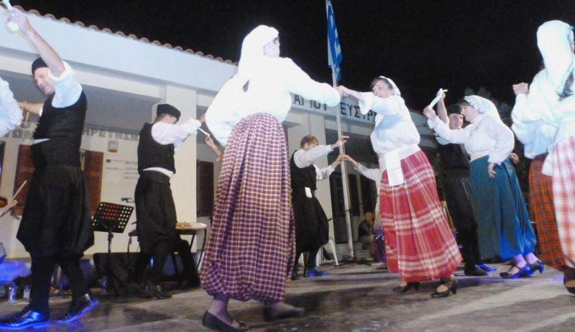 Το Σάββατο, 27-7-2013, το πρωί ξεναγηθήκαμε από τον ίδιο το Δήμαρχο στο λόφο του Αγίου Μηνά, όπου ο Πρόεδρός μας Κλεάνθης Κορομηλάς κατέθεσε εκ μέρους της αποστολής μια ανθοδέσμη στο οστεοφυλάκιο των θανόντων από την πείνα του χειμώνα 1941-1942 εξόριστων λαϊκών αγωνιστών, στη συνέχεια στο μοναδικό θεματικό Μουσείο της Δημοκρατίας (πρώτο διδακτήριο του χωριού και μετέπειτα Αναρρωτήριο - Αγροτικό Ιατρείο των εξόριστων) και τέλος στην ανακαινισμένη Μαράσλειο – Λογοθέτειο Σχολή, που έγινε το 1909 με δαπάνες της εν Αλεξανδρεία Αδελφότητος ‘Ο Άγιος Ευστράτιος’. Στις 9 το βράδυ στην κατάμεστη από κόσμο κεντρική πλατεία του χωριού, μπροστά στο Δημαρχείο, η Παραδοσιακή Κομπανία και το Χορευτικό Ενηλίκων άνοιξε την αυλαία των εκδηλώσεων του φετινού πολιτιστικού καλοκαιριού του Δήμου Αγίου Ευστρατίου παρουσιάζοντας στο πρώτο μέρος τη μουσικοχορευτική παράδοση της Λέσβου και των απέναντι μικρασιατικών παραλίων και στο δεύτερο μέρος ένα πρόγραμμα με λαϊκά και ρεμπέτικα τραγούδια. Η Γιώτα Μαϊστρέλη (φωνή), η Γιάννα Μαϊστρέλη (βιολί), ο Στρατής Καζατζής (σαντούρι, μπαγλαμά, φωνή), ο Ερμόλαος Κατζουρίδης (κλαρίνο), ο Αλέκος Καφούνης (κιθάρα, φωνή) και ο Γιάννης Τσάμης (μπουζούκι) ενθουσίασαν το ακροατήριο, που τους αποζημίωσε με θερμό χειροκρότημα. Στο τέλος μάλιστα πολλοί Αγιοστρατήτες ερχόμενοι στο τσακίρ κέφι σηκώθηκαν και χόρεψαν, πρωτοστατούντος του Δημάρχου Μπάμπη Μακρή. Το βράδυ, μετά το δείπνο, τα όργανα ξανάβγαλαν φωτιές! Αυτή τη φορά έπαιζαν μέχρι το πρωί. Μόλις ρόδισε η ανατολή ξεχύθηκαν στους δρόμους του χωριού για την παραδοσιακή… πατινάδα! Οι μελωδίες πλανήθηκαν πάνω απ’ το χωριό ξυπνώντας ευχάριστα τους έκπληκτους κατοίκους. Στις 9 π.μ. της Κυριακής, αποχαιρετήσαμε τον κ. και την κ. Μακρή και επιβιβαστήκαμε στο ΑΙΟΛΙΣ, για να πάρουμε το δρόμο της επιστροφής. Τον ύστατο αποχαιρετισμό στο νησί απηύθυνε απ’ το κατάστρωμα του πλοίου με το κλαρίνο του ο Ερμόλαος Κατζουρίδης παίζοντας τον παραδοσιακό σκοπό του «νυφ’κάτου»! Επιστρέψαμε στη Μυτιλήνη αεροπορικώς από τη Μύρινα το απόγευμα της ίδιας μέρας, κουβαλώντας μαζί μας υπέροχες αναμνήσεις και υποσχόμενοι να ξαναπάμε στο φιλόξενο νησί.