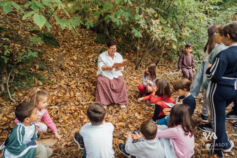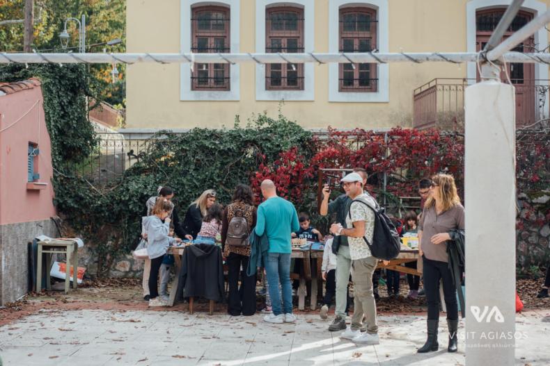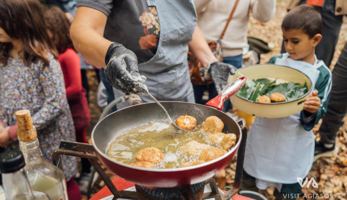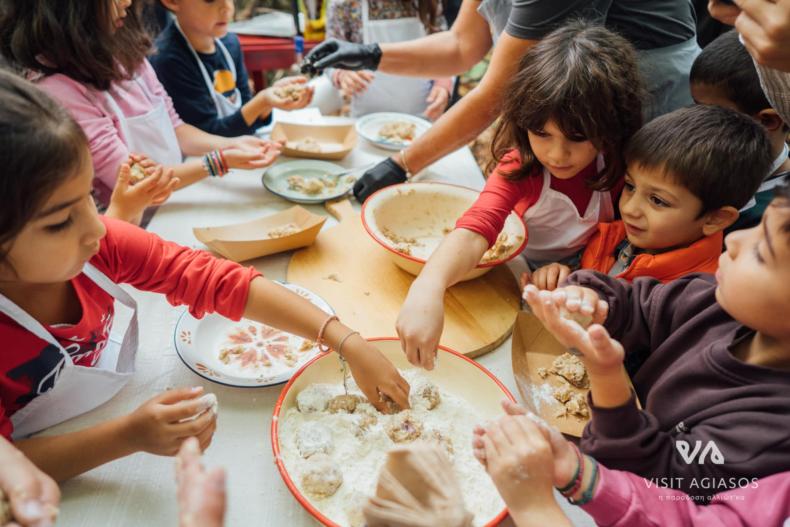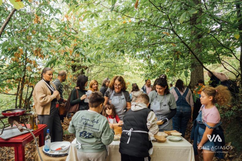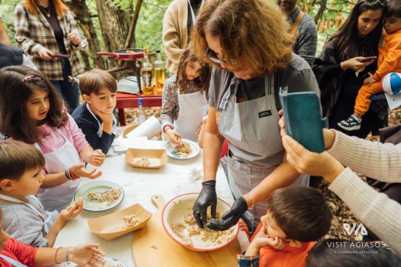 Στο πανέμορφο Καστανιώνα, στήθηκε το βιωματικό εργαστήριο μαγειρικής «Καστανοπταρέλια». Εκεί, τα παιδιά φόρεσαν ποδιές, έπιασαν κουτάλες και, με οδηγούς τις μαγείρισσες Ελπίδα Κουμαρέλα και Μαρία Ξενιτέλη από το εστιατόριο Δρότα, έφτιαξαν το πιο παραδοσιακό φαγητό της Αγιάσου.