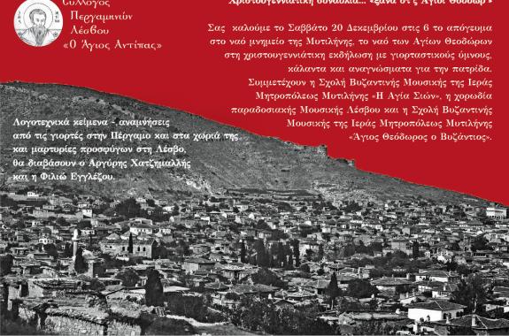 Το Σαββάτο 20 Δεκεμβρίου στις 6 το απόγευμα στο ναό μνημείο της Μυτιλήνης, το ναό των Αγίων Θεοδώρων (που μας θυμίζει τους Αγίους Θεοδώρους, τον παλιό Επισκοπικό Ναό της Περγάμου) ο Σύλλογος Περγαμηνών Λέσβου «Ο Άγιος Αντίπας» οργανώνει χριστουγεννιάτικη εκδήλωση με γιορταστικούς ύμνους, κάλαντα και...
