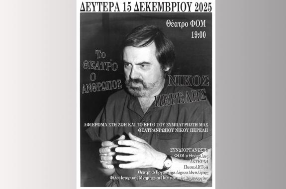 Στα τέλη του Σεπτέμβρη έφυγε από τη ζωή ο μεγάλος Μυτιληνιός θεατράνθρωπος ,συγγραφέας, σκηνοθέτης και δάσκαλος Νίκος Περέλης. Οι θεατρικές ομάδες της Μυτιλήνης : ΦΟΜ ο Θεόφιλος, ΘΟΜ ΑΣΤΕΓΟΙ, ΠασπARTτού και Θεατρικό Εργαστήρι Δήμου Μυτιλήνης ύστερα από πρόταση και σε συνεργασία με τους Φίλους...