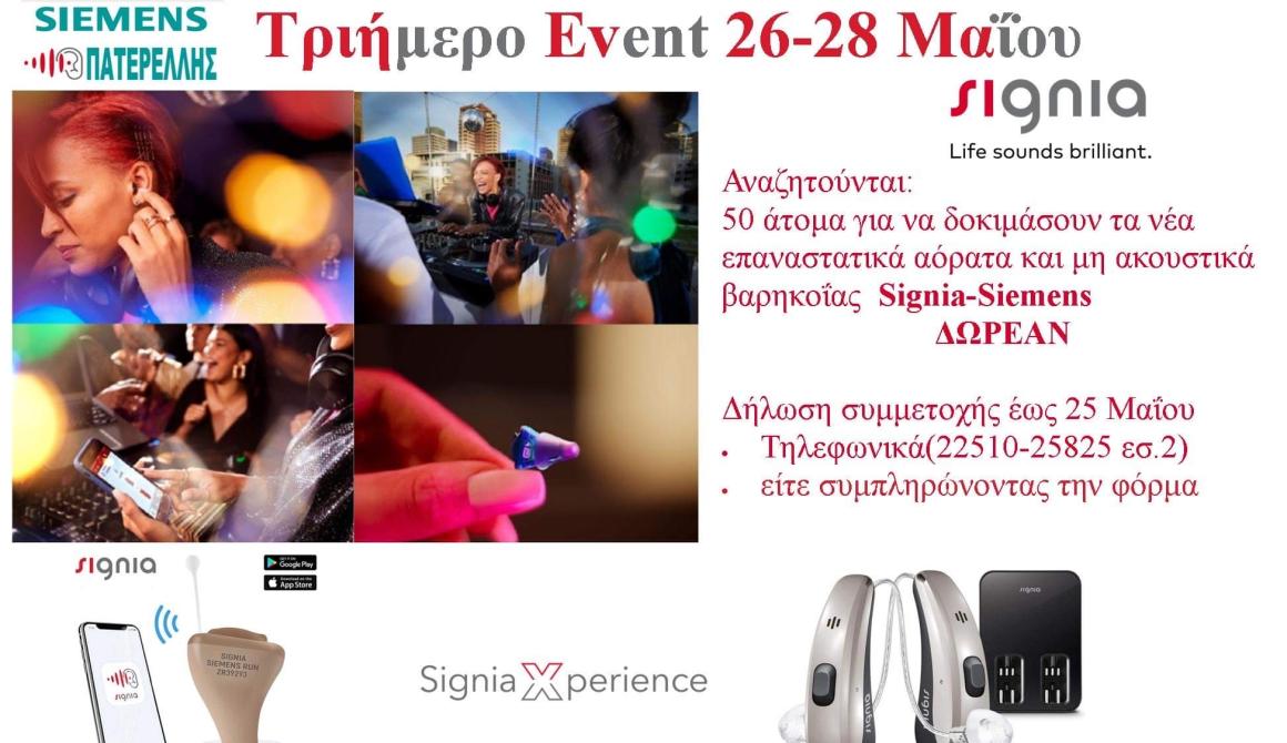 Η εταιρεία ΠΑΝΤΕΛΗΣ ΠΑΤΕΡΕΛΛΗΣ ΚΑΙ ΣΙΑ Ε.Ε. καινοτόμος στο χώρο των ακουστικών βαρηκοϊας SIEMENS - SIGNIA εδώ και 15 χρόνια, διοργανώνει τριήμερο evnt δωρεάν ενημέρωσης – δοκιμής και εφαρμογής ακουστικών SIEMENS –SIGNIA, στις 26 με 28 Μαϊου.