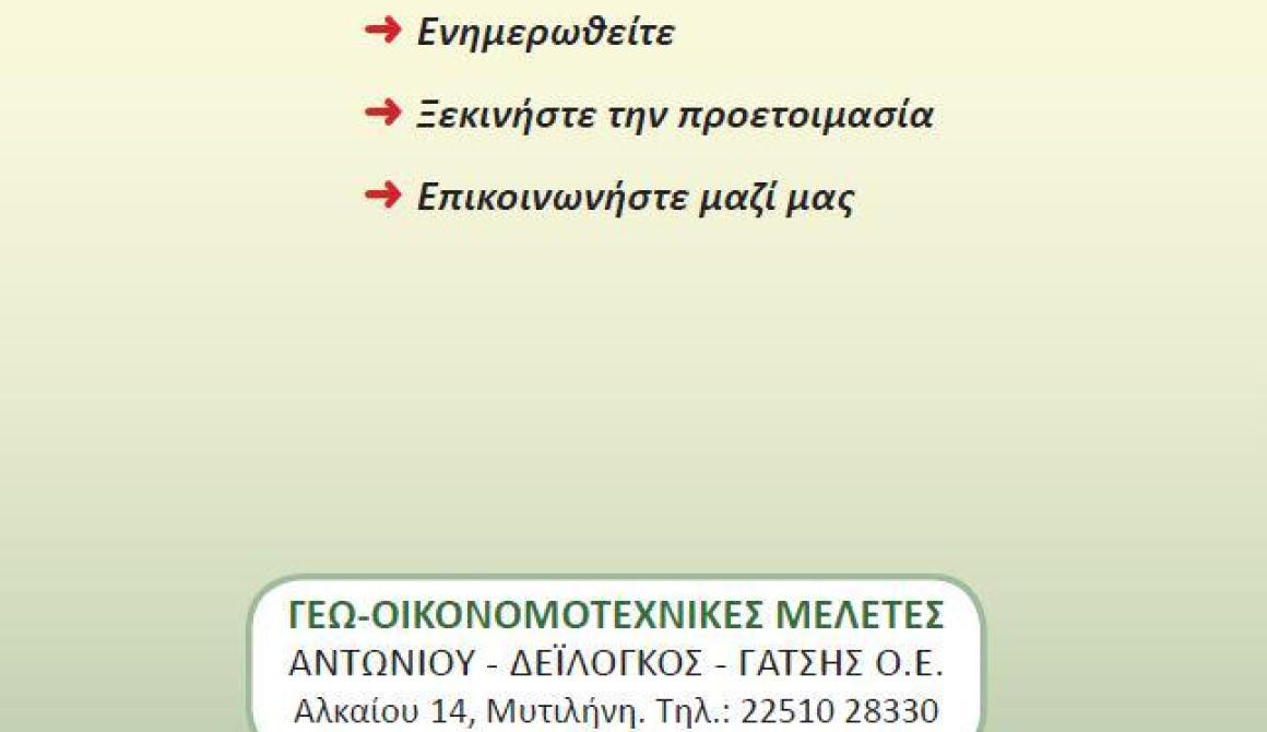 Ύψος ενίσχυσης: Η οικονομική ενίσχυση της πρώτης εγκατάστασης Νέων Γεωργών καταβάλλεται σε 3 δόσεις. Το 70% την οικονομικής ενίσχυσης θα καταβληθεί αμέσως μετά την έγκριση του Νέου Γεωργού. Το ύψος της ενίσχυσης εξαρτάται βασικά από την περιοχή μόνιμης κατοικίας και το μέγεθος της εκμετάλλευσης στην μελλοντική κατάσταση. Όλες οι περιοχές της Λέσβου είναι ορεινές ή μειονεκτικές επομένως το ύψος της οικονομικής ενίσχυσης για κτηνοτροφική ή φυτική παραγωγή είναι από 15.000 (το ελάχιστο) έως 20.000 ευρώ (το μέγιστο)