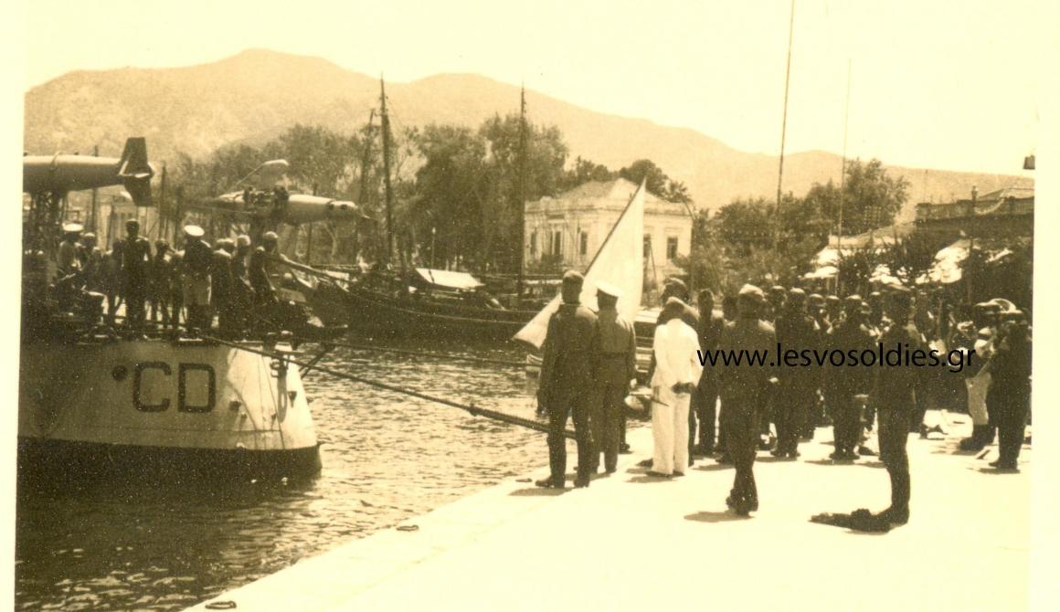 Κατά τις 10 ήρθε ένα Αγγλικό πλοιάριο φέροντας 2-3 Άγγλους στρατιώτες, ο κόσμος πλημμύρισε την προκυμαία, οι Αγγλοελληνικές σημαίες κυμάτιζαν πάνω από τα κεφάλια μας. Το χειροκρότημα και τα «ζήτω» δεν έπαψαν καθ’ όλην την διάρκεια της αποβίβασης των Άγγλων και της διαδρομής τους εις το ξενοδοχείον «Αιγαίον». Όπου είχαν σχηματισθεί πρόχειρα μία αψίς με λουλούδια και με διάφορες σημαίες. Τόσος ήταν ο ενθουσιασμός του κόσμου ώστε πήραν στους ώμους τους τους Άγγλους φέροντας τους σηκωτούς μέχρι το ξενοδοχείο. Έχουν έρθει μαζί με τους Άγγλους και λίγοι Έλληνες του τακτικού Ελληνικού στρατού του Καϊρου μεταξύ των οποίων ο γνωστός Πρίμος Γεώργιος, Δημητρόπουλος, Οπρόπουλος κ.α. η στολή τους είναι όμοια του Αγγλικού στρατού ξηράς, τον αγγλικό σκούφο επί του οποίου είναι το Ελληνικό βασιλικό στέμμα.