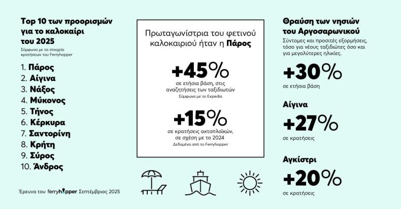 Η εύκολη πρόσβαση, το χαμηλότερο κόστος και η ποικιλία εμπειριών καθόρισαν τις φετινές επιλογές. Οι Κυκλάδες και ο Αργοσαρωνικός βρέθηκαν και πάλι στην κορυφή, με πρωταγωνίστρια την Πάρο, η οποία σημείωσε εντυπωσιακή άνοδο (+45% στις αναζητήσεις στο Expedia και +15% στις ακτοπλοϊκές κρατήσεις).