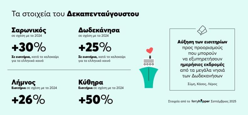 - Δωδεκάνησα: Σημαντική αύξηση κίνησης, ιδιαίτερα μεταξύ των ίδιων των νησιών (Ρόδος, Κως), αναδεικνύοντας τάση για σύντομες εκδρομές.