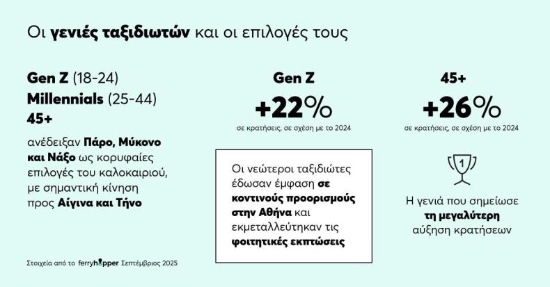 - Η Gen Z σημείωσε αύξηση εισιτηρίων άνω του 20%, επιλέγοντας κοντινούς προορισμούς (Σύρος, Αίγινα).