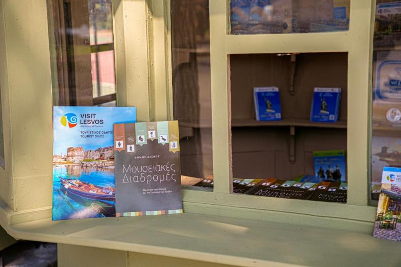 Στο info kiosk, οι επισκέπτες του νησιού μπορούν να προμηθευτούν έντυπο ενημερωτικό υλικό για τον προορισμό της Λέσβου, το οποίο έχει δημιουργηθεί από τον Δήμο Μυτιλήνης, αλλά και υλικό που έχει παραχωρήσει η Περιφέρεια Βορείου Αιγαίου και το Επιμελητήριο Λέσβου.