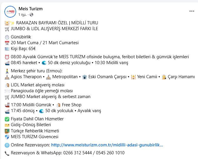 Το μεγάλο τούρκικο τουριστικό πρακτορείο Meis Turizm, προωθώντας ημερήσια εκδρομή στη Μυτιλήνη για την περίοδο του Ramadan Eid (τη μεγάλη γιορτή που σηματοδοτεί το τέλος του Ραμαζανιού) παρουσιάζει ένα πρόγραμμα που συνδυάζει περιήγηση στο ιστορικό κέντρο, επίσκεψη σε θρησκευτικά και ιστορικά μνημεία και χρόνο για φαγητό και αγορές. Μέχρι εδώ, τίποτα το ασυνήθιστο για μια ημερήσια τουριστική εκδρομή.