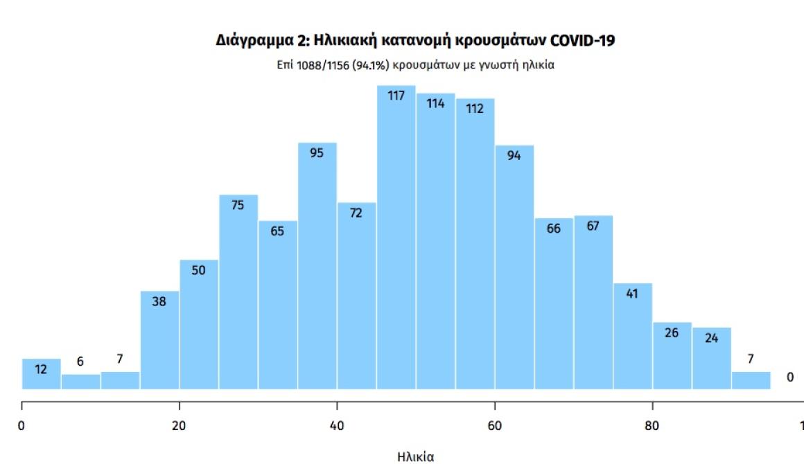 Όσον αφορά την ηλικιακή κατανομή των κρουσμάτων, τα περισσότερα καταγράφονται στις ηλικίες από 45 έως 60 ετών (συνολικά 343).